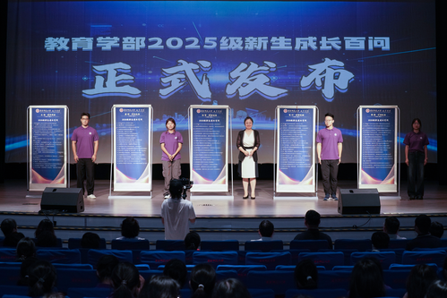 600cc全讯白菜网党委书记闫露与新生代表共同启动“教育学子新生成长百问”发布仪式。今年迎新季学部向2025级新生们征集了关于成长的100个问题,从“如何理解中国特有的教育家精神”到“如何应对AI时代的教育变革”,从“如何平衡学业与健康”到“如何通过实践回应强国需求”等等,每一个问题都折射出新时代教育学子对学科、对人生、对世界的关切与求索。