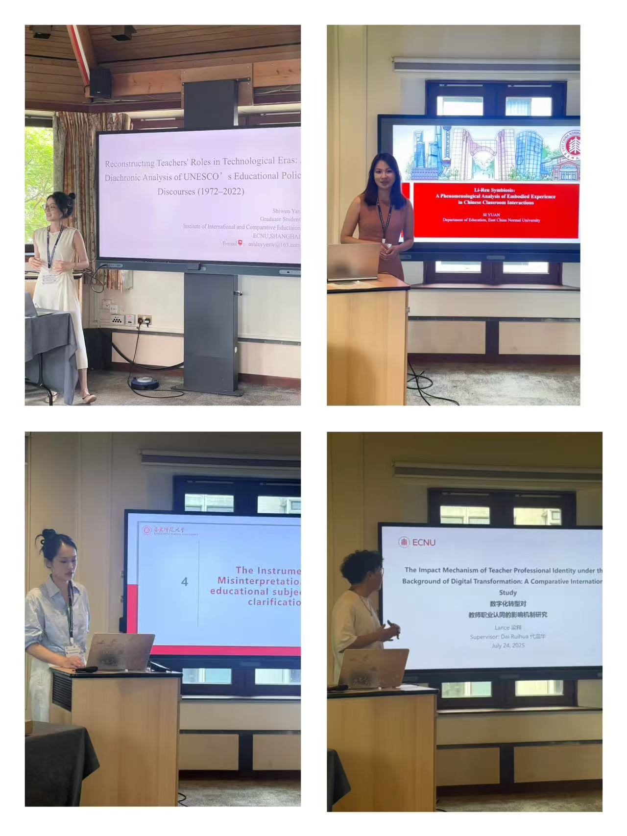 7月23日至24日,严诗雯、思远、陈璇木子、梁释等4位研究生分别在教育技术、教育哲学与比较教育等主题分论坛中进行口头报告,聚焦教师角色演变、课堂交往实践、哲学传统重释及专业认同建构等议题,展示了学术厚度与理论探索精神。汇报后,学生们积极与来自剑桥大学、伦敦大学学院等国际高校的学者展开交流互动,进一步拓展了学术视野。