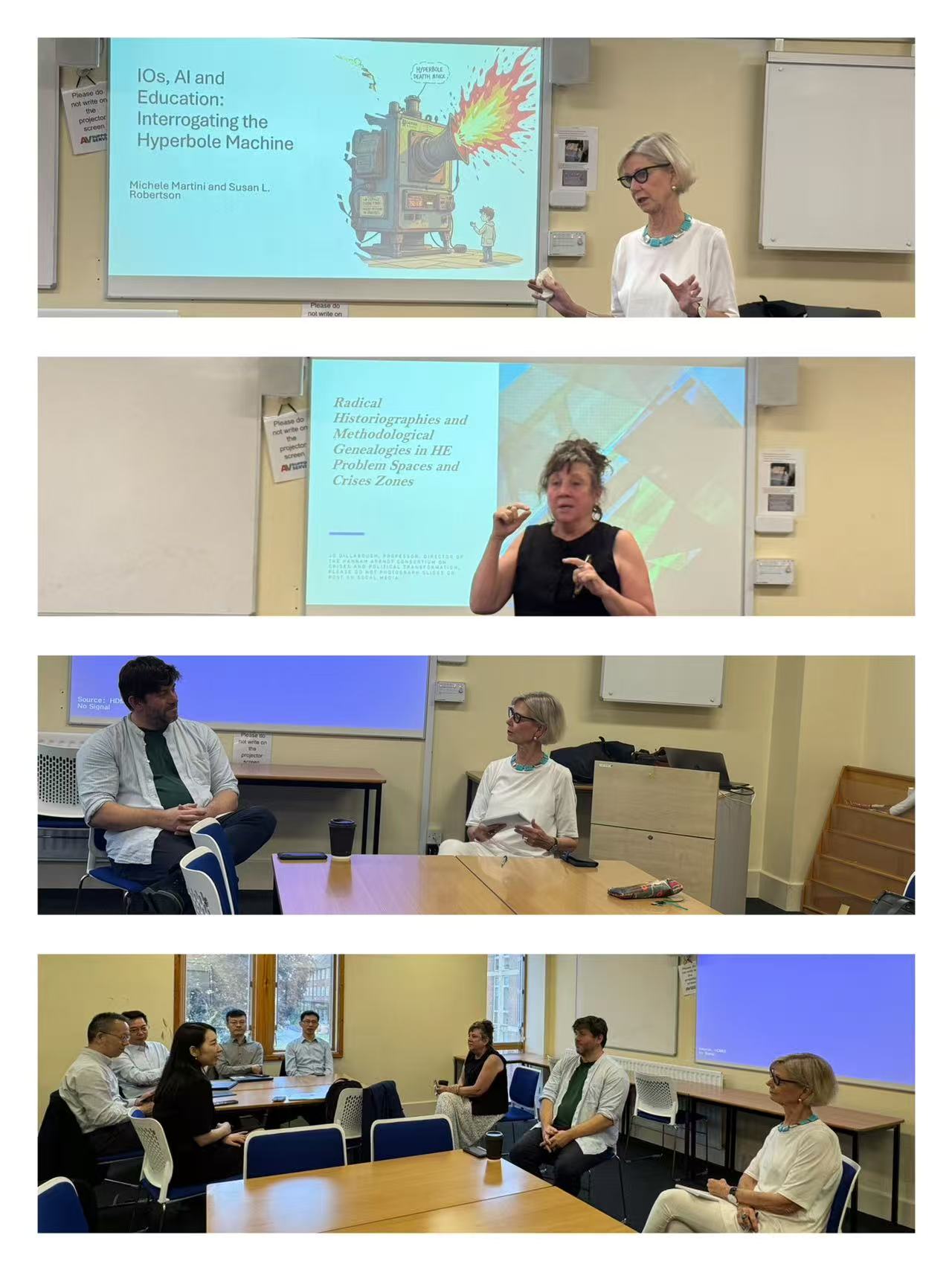 7月22日,在剑桥大学教育学院前院长Susan Robertson教授与教育学院副院长Jo-Anne Dillabough教授主持的“Cambridge-ECNU学术周论坛”中,师生展开跨界跨学科对话。Susan Robertson分享了“International Organisations, AI and Education: Interrogating the Hyperbole Machine”主题报告,通过对国际组织AI教育政策话语的批判性审视,揭示了其中存在的夸大宣传、对关键角色的忽视以及潜在的市场化和去公共化风险。Jo-Anne Dillabough分享了最新研究“Radical Historiographies and Methodological Genealogies in HE Problem Spaces and Crises Zones”,探讨了不同国家间在教育理解与方法论上的功能差异,尤其聚焦于“跨大西洋”视角下,欧美国家如何在比较教育的理论生产中施加影响。